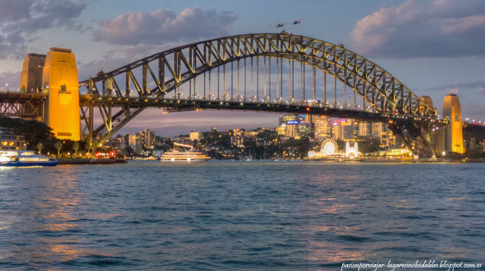 Un momento emocionante e inolvidable de nuestro viaje, fue cuando el Noordam atravesó el Harbour Bridge. Ante la espectacular panorámica global del puerto de Sydney, nuestra mirada se focalizaba una y otra vez en el cautivador perfil arquitectónico de la Opera House. Pero además, tuvimos la fortuna de que en el preciso momento que pasabamos por debajo del Harbour Bridge, también lo atravesaba un tren que nos saludó con una "pitada" de su bocina, al que lógicamente correspondió el Noordam con un "bufido" de su sirena. Un momento mágico que complementaba una espectacular imagen visual con la audición de esos sonidos que excitaban si cabe más nuestros sentidos.
